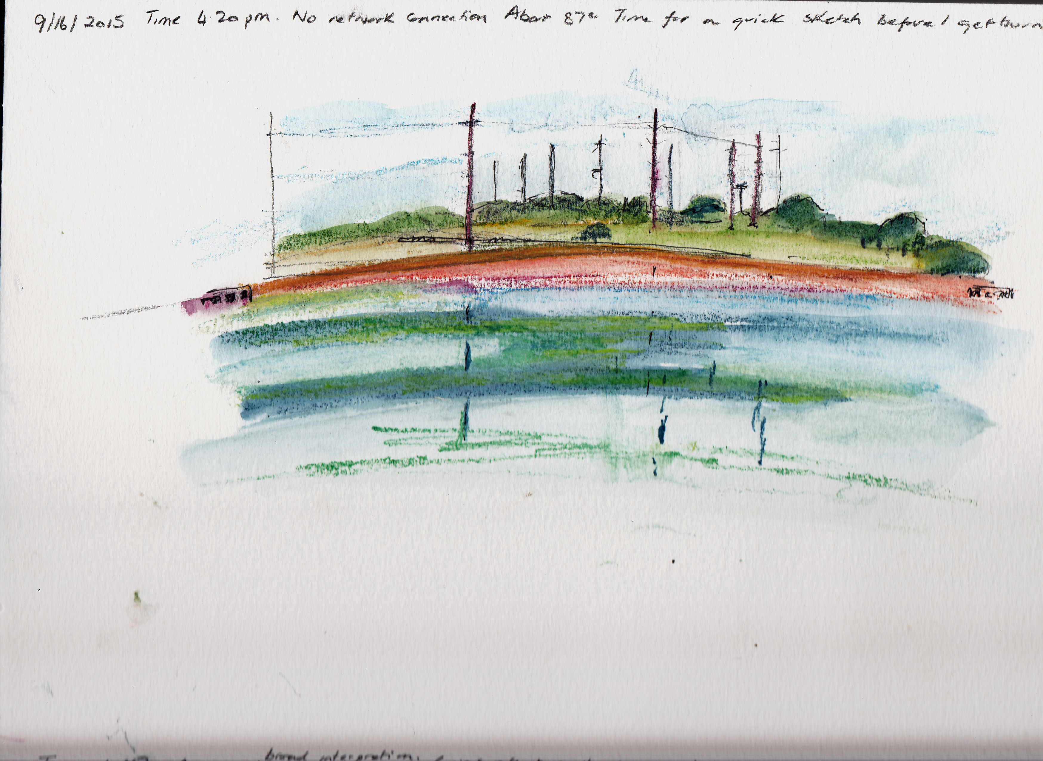 My last effort to paint was at Mayfield park near the centre of Austin, another paint out with the group. It was mobbed with families and one time I had to stop a child from dipping their fingers into the paint! In the background were loud booms from explosions and artillery fire as they were re-staging an war time event at the Camp Mabry which is less than a ¼ mile from the park. Also in the back ground were peacocks who shrilled loudly every time there was an explosion or burst of artillery was fired . All in all, not the best place to paint. I failed miserably. I went back on the Tuesday before the rain arrived but I only made the painting worse! I don’t think I could be an urban sketcher/painter somehow, I would get too distracted!