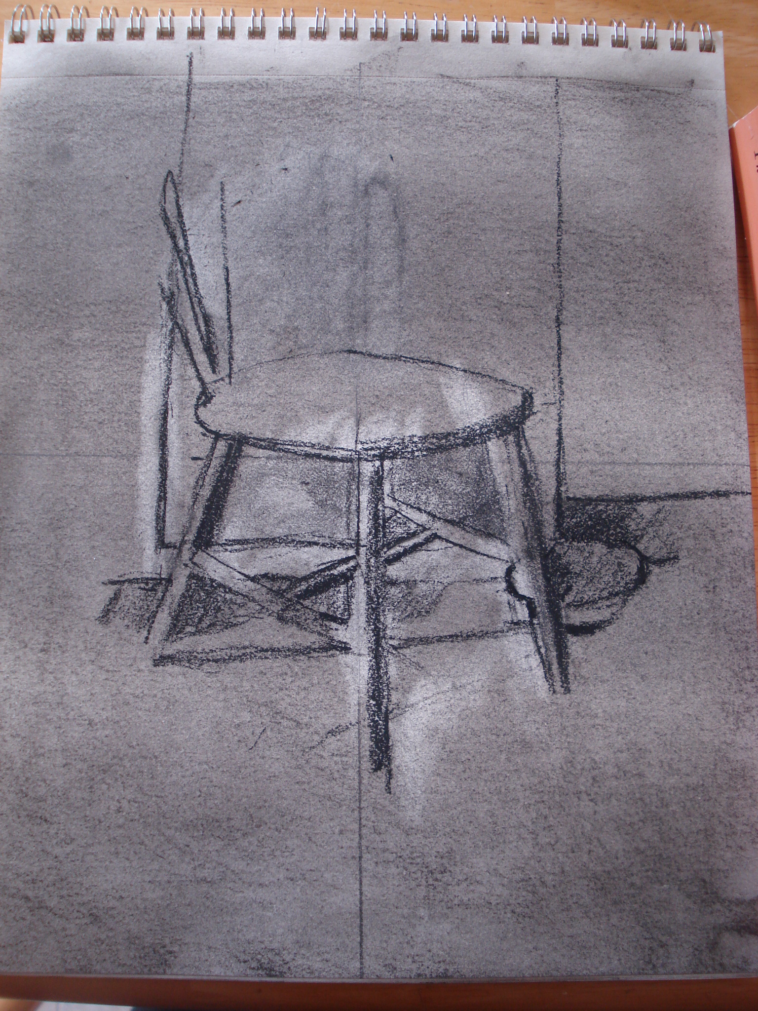 So after about 15 minutes of the others peering over her shoulder, Linda then demonstrated to the class how to abstract from the still life in front of us, using a charcoal drawing as a base and how that would blend into the acrylics. Once we had worked on that part of the technique, she should us how pastels could be worked into the painting.
