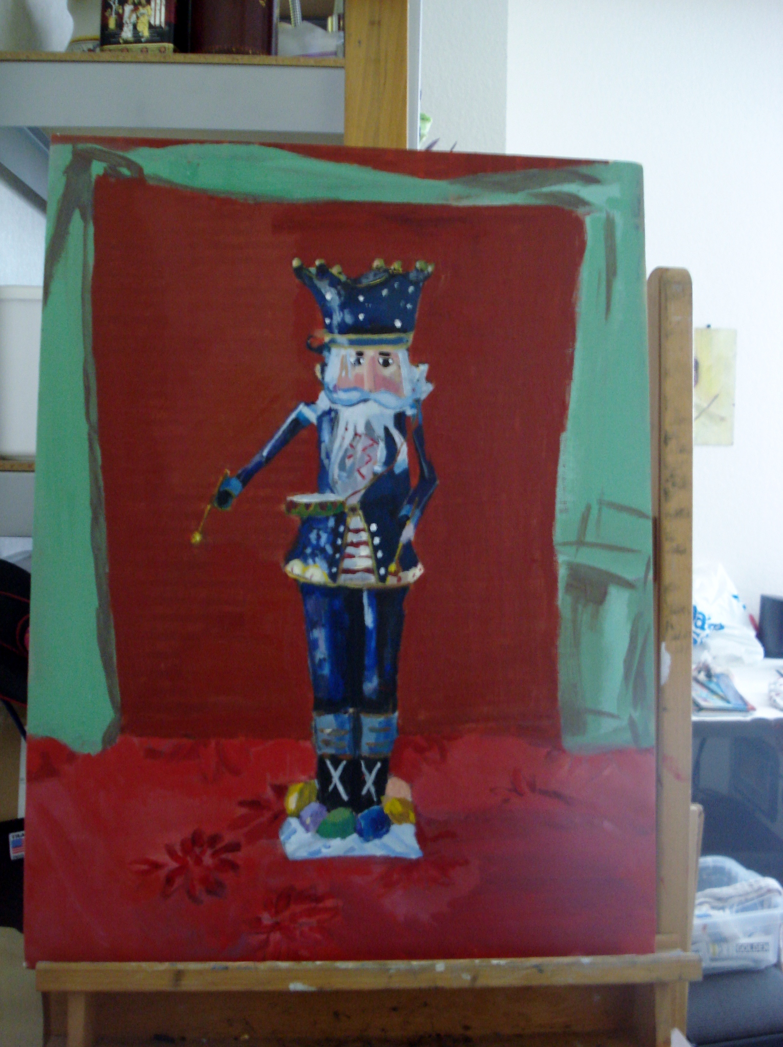 As to the actual painting, I was fairly pleased with the way it came out, given that I started on the wrong foot. At Camberwell, we didn’t really do that much in the way of still life but if we did, it was staged towards a wall with no distractions from the setup and the class would cluster around in a semi-circle. This was set in the middle of the room with lots of other distractions.