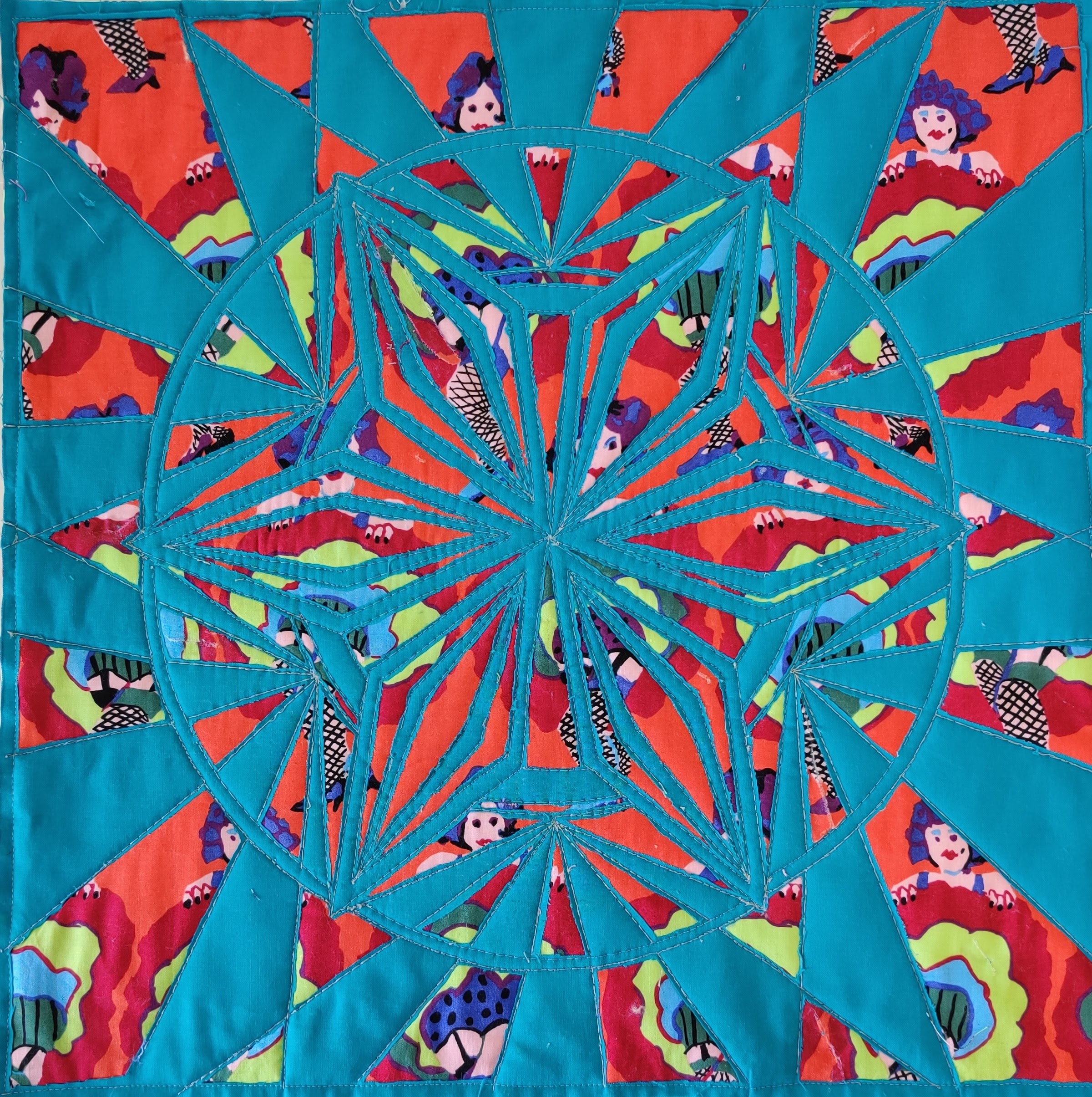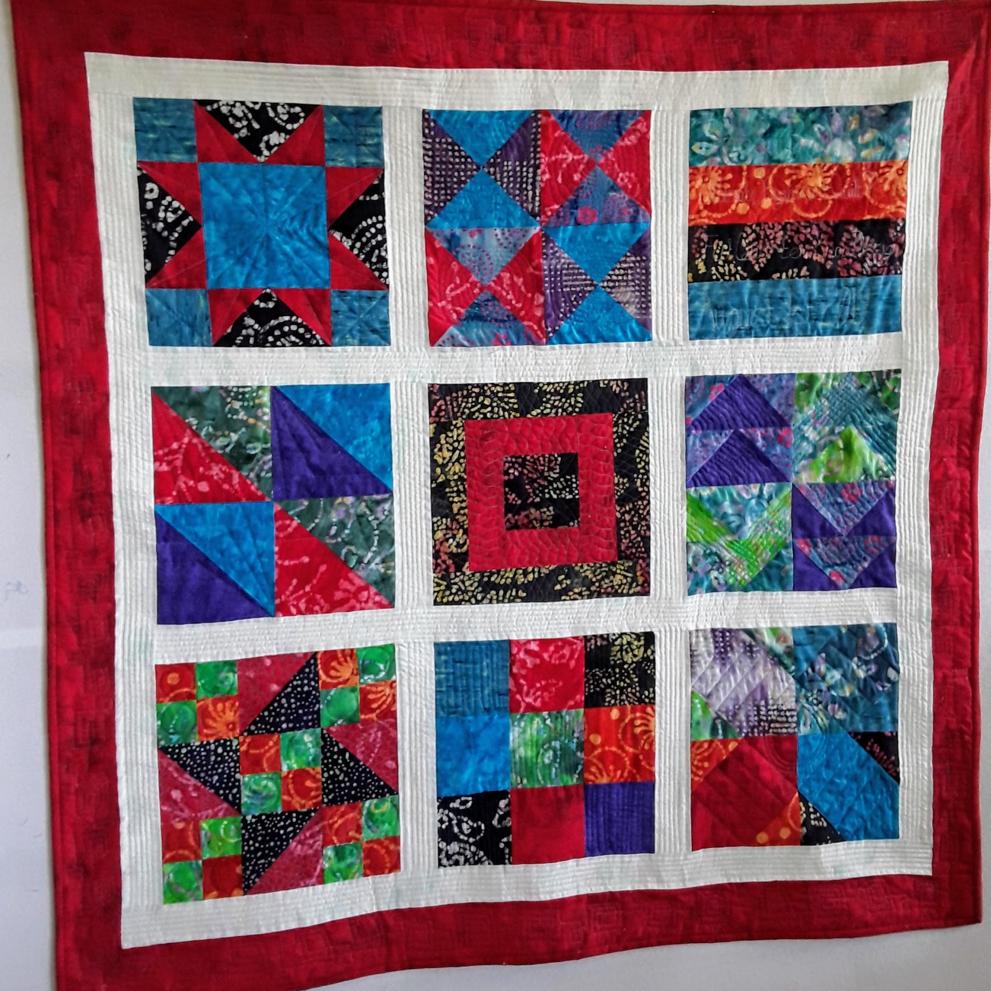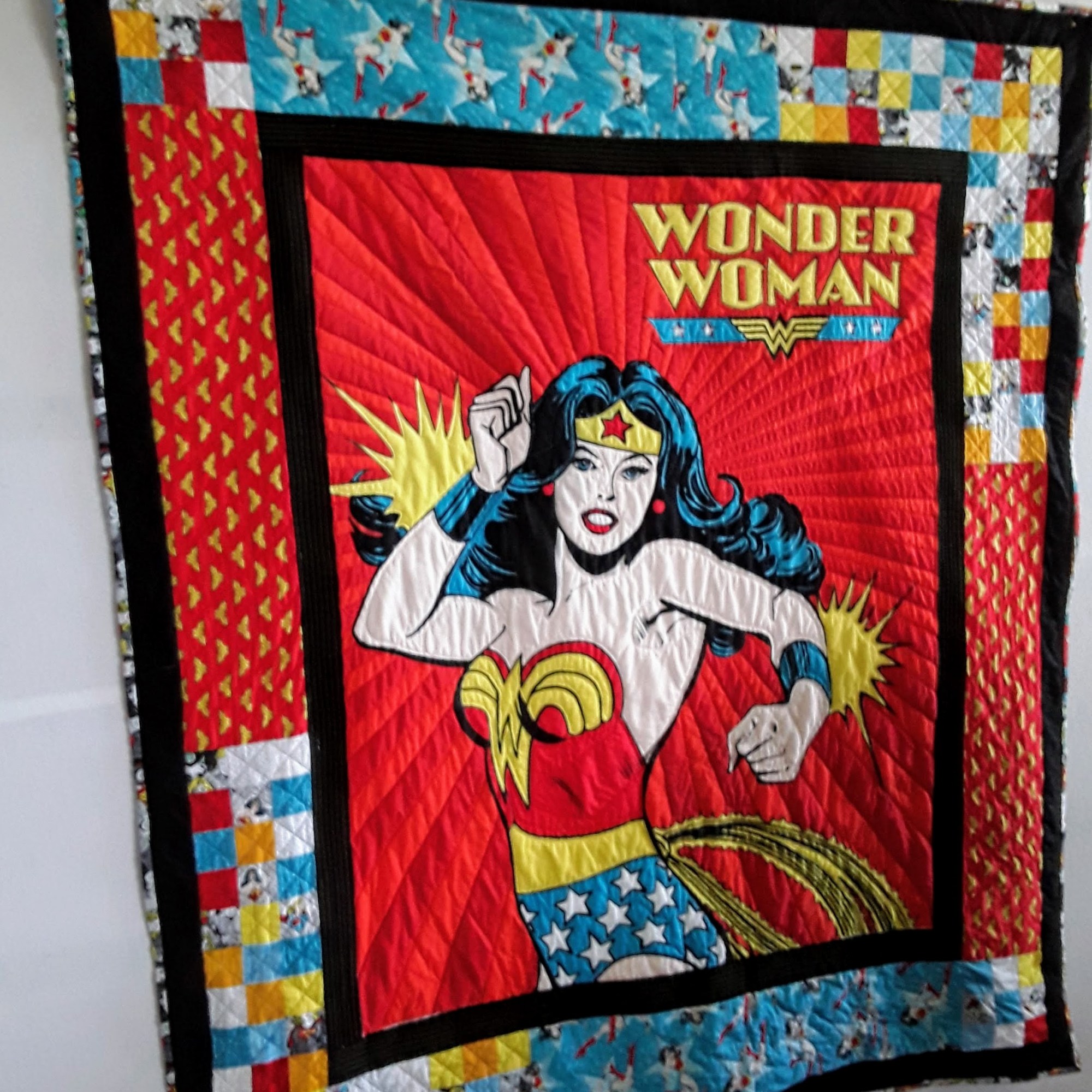 I followed a pattern in a class or online for these quilts. I called my first quilt the Oops, as it was my first attempt at making a quilt, and it was a disaster. I was following a book, and I am pretty dyslexic following instructions in a book. I do not understand diagrams, a reason I am not sewing garments or constructing wooden forts! The next one was a quilt as you go quilt following a series of videos on YouTube by Leah Day. The videos were more to do with quilting rather than block making. My 3rd quilt was made in a class held by a local quilt store. The quilting was done after the class and designed by myself. In between making the quilt top from this class and then quilting it. Finally, I followed a couple of quilt-along videos published weekly on YouTube by the Fat Quarter Shop and Pat Sloan. I have yet to quilt the Pat Sloan quilt top. That will be the last big quilt I plan to do, and I will quilt it using the Westalee quilting rulers. The Wonder Woman quilt was quite a challenge as the pattern was different from the image provided.